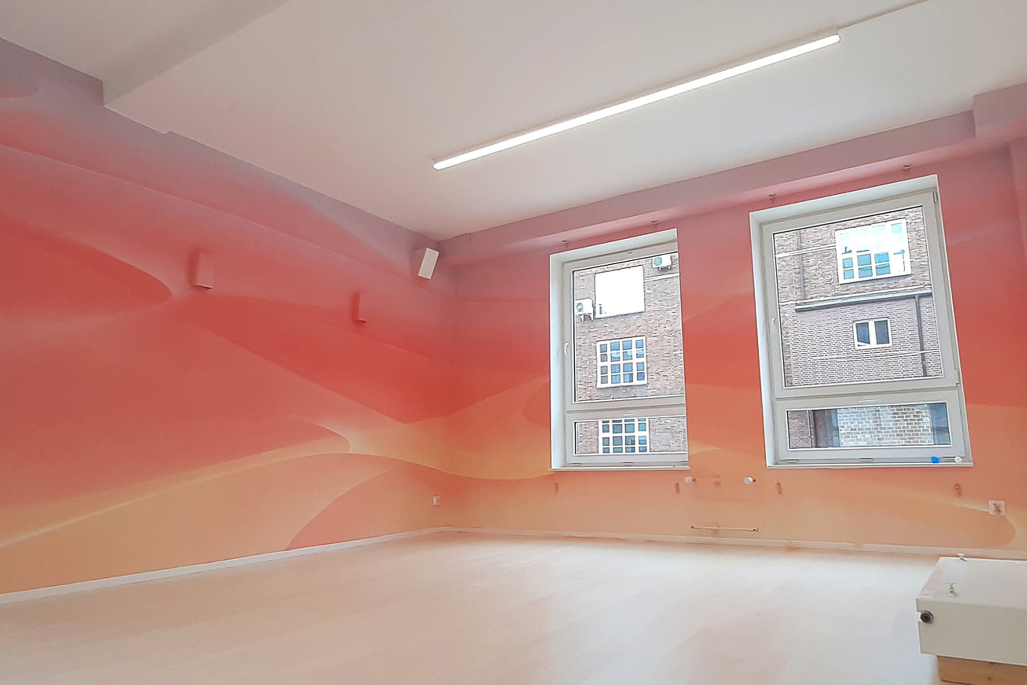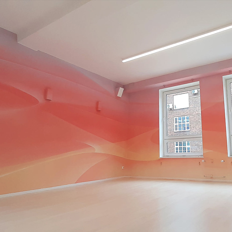 Najczęściej pracuję we wnętrzach, w których duże, otwarte powierzchnie pozwalają oddychać formie i kolorowi — w salonach, sypialniach czy pracowniach. Chętnie korzystam z własnych projektów, łącząc doświadczenie z otwartością na wizję klienta. Wspólnie poszukujemy balansu między estetyką, funkcją i emocją, dzięki czemu mural staje się integralną częścią wnętrza — jego głosem i duszą.